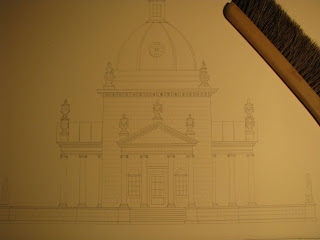 At long last the under drawing is complete so it is time to step back again to see if I need to make any revisions. I am not completely happy with the shape and overall height of the dome so I may have to go back and redraw. It is good to make these corrections now because once you have applied your first wash, that’s it! When erasing be sure to use a kneaded or rubber eraser, which is much less damaging to the watercolor paper. Standard and pink erasers will damage the surface of the paper and undoubtedly leave colored marks all of your paper.