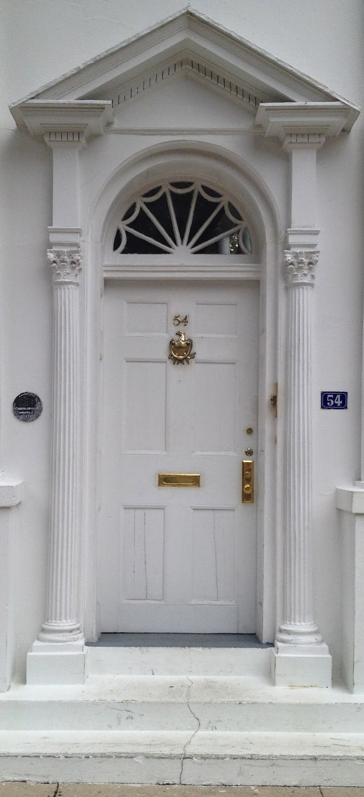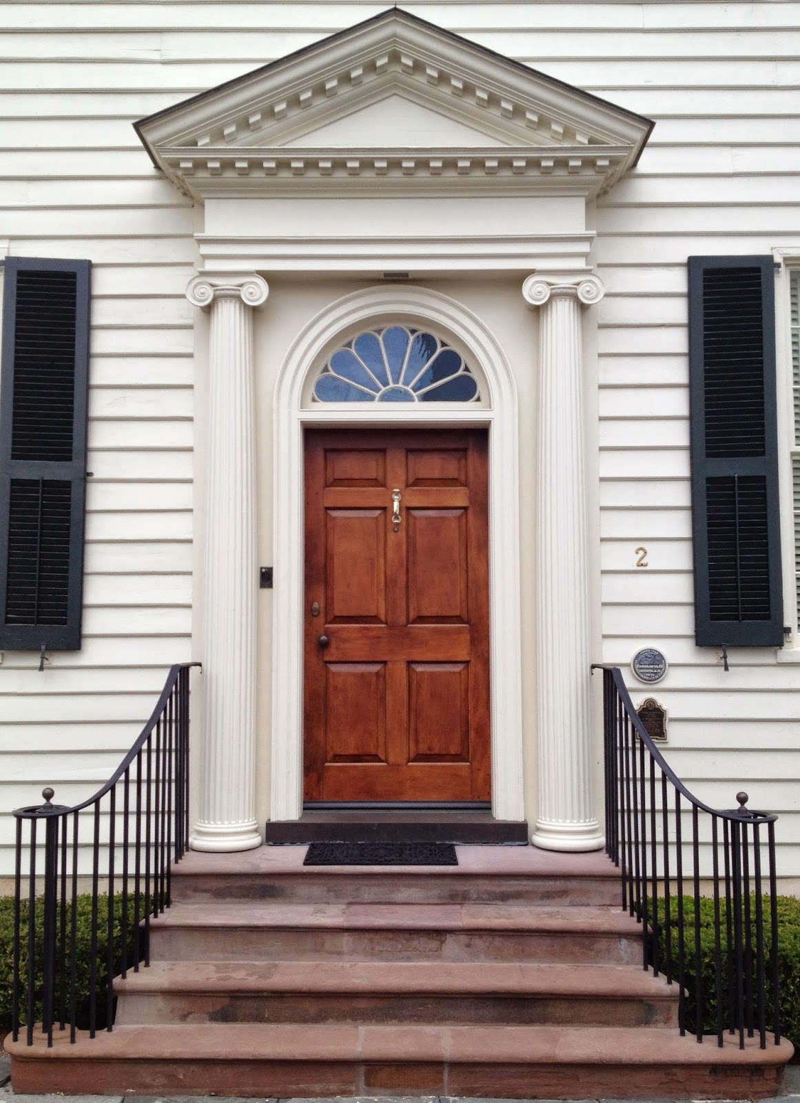 I was recently going through my photo albums and came across the pictures that I took last year during a trip to Charleston. During that trip, I spent most of my time wandering the beautiful tree lined streets of historic downtown Charleston. One of the many things I enjoyed most was photographing all of the beautiful variations of front door designs ranging from Georgian, to Federal and even Greek Revival. It was as if each home owner was trying to outdo their neighbors by using unique paint colors and variations of greenery. I love how creeping fig vine seems to grow everywhere in Charleston. It is well suited to the warm, semi tropical climate and people have been quite creative with it.