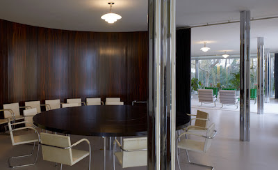 The famous “Glass Room” or Living Room. Note the green “Barcelona” chairs and ottoman which were designed by Van Der Rohe in 1929.